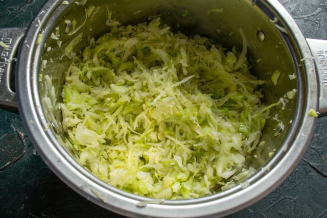 Нарежьте капусту тонкой соломкой — не толще 3–4 мм. Машинка-шинковка или овощечистка сэкономят силы. Чем тоньше стружка — тем быстрее выделится сок.