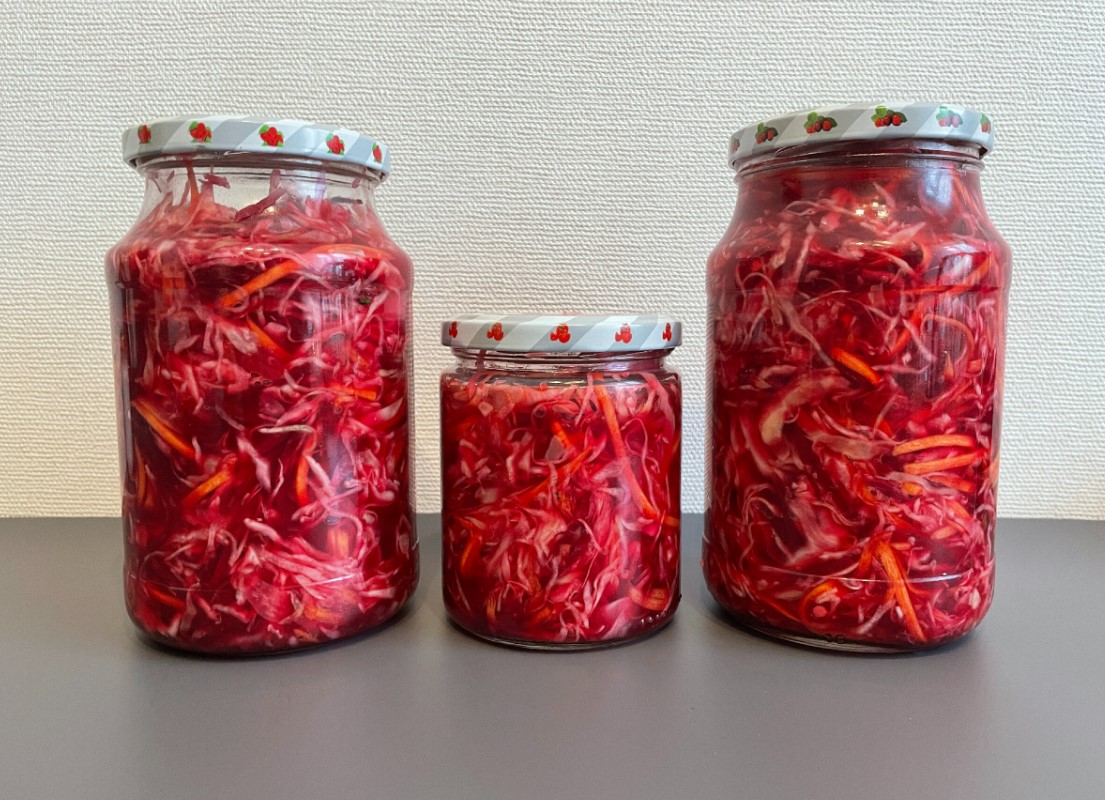 Горячим маринадом заливаем овощи, перемешиваем и даём немного остыть. Перекладываем в глубокую посуду, накрываем тарелкой и ставим гнёт — например, банку с водой. Важно: все овощи должны быть покрыты жидкостью. Оставляем на ночь при комнатной температуре — за это время капуста пропитается и даст дополнительный сок. Утром убираем в холодильник на два-три дня. Именно время творит чудеса: капуста становится хрустящей, но не жёсткой, лук теряет остроту, а вся масса приобретает нежный розовый оттенок.