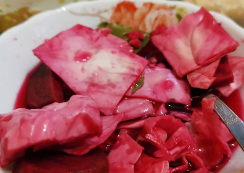 Укладываем овощи слоями в трёхлитровую банку: кусок кочана, кусок свеклы, щепотка соли. Повторяем до верха. Заливаем холодной кипячёной водой так, чтобы всё было покрыто жидкостью. Сверху ставим гнёт — небольшую банку с водой или тарелку с грузом. Первые два-три дня держим при комнатной температуре: начнётся брожение, появятся пузырьки. Как только активность спадёт, убираем в холод. Уже через пять дней заготовка готова — кисло-сладкая, хрустящая, с красивым розовым оттенком.