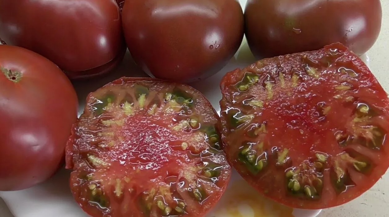 Третий — «Микадо Черный». Для тех, кто устал от привычного вкуса. Плоды с бордово-коричневым отливом, кожица плотная — не трескается даже в дождь. Вкус необычный: сладкий с фруктовыми нотками, будто в помидоре спряталась спелая вишня. Крупные картофельные листья защищают плоды от солнца, а сам куст плодоносит стабильно — до самых заморозков. Вес до 300 граммов, дозаривать не нужно: созревают на кусту полностью.