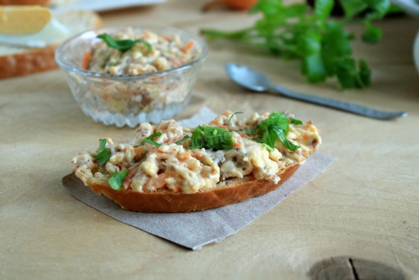 Для более насыщенного вкуса готовую закуску лучше убрать в холодильник на 1–2 часа: так ингредиенты «подружатся», ароматы раскроются, а структура станет чуть плотнее и удобнее для намазывания. Но если времени нет — можно подавать и сразу, всё равно будет вкусно.