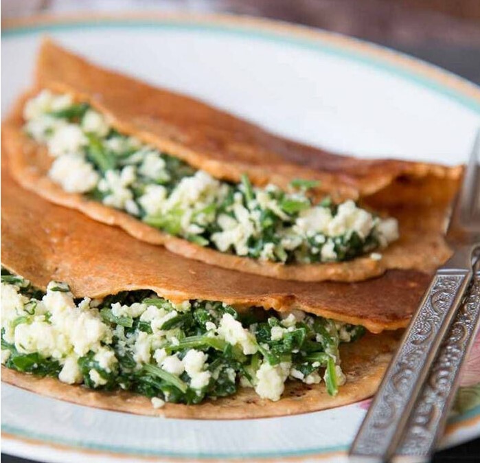 Ингредиенты на одну порцию базового овсяноблина: три столовые ложки овсяных хлопьев, два яйца, щепотка соли. Всё. Дальше — пространство для фантазии: добавляйте зелень, специи, творог, авокадо, ветчину — что душа пожелает.