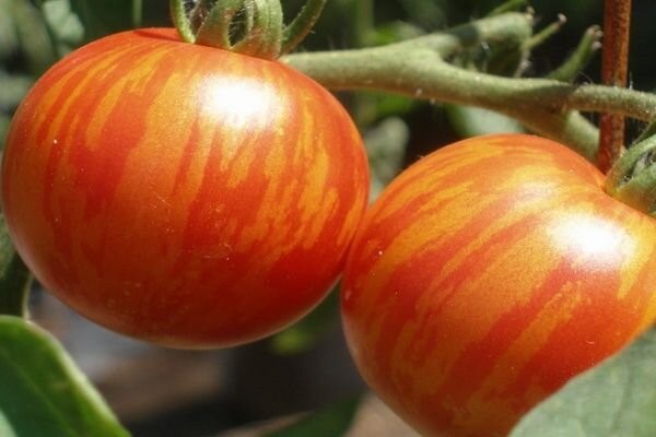 Плоды у этого сорта — настоящая гордость. Округлые, весом до 120 г, с уникальной полосатой окраской: в технической спелости — зелёные со светло-зелёными полосами, а когда поспеют — становятся красными с яркими жёлтыми полосами. Выглядят так, будто их расписывал художник! И вкус не подводит: сладкие, сочные, с насыщенным ароматом — идеальны и для салатов, и для заготовок.