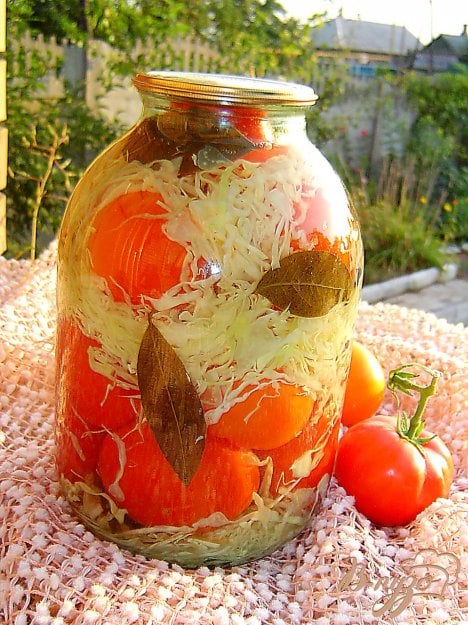 Совет хозяйке: выбирайте для заготовки плотные помидоры с толстой кожицей — они лучше держат форму при стерилизации. Капусту шинкуйте не слишком тонко, чтобы она не превратилась в кашу, а сохранила текстуру.