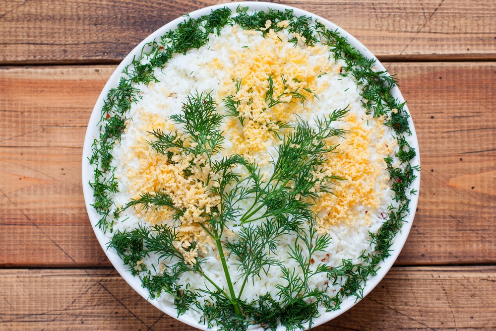 Украсьте веточками укропа, имитируя цветы мимозы. Перед подачей дайте салату постоять 15–20 минут в холодильнике — так вкусы «подружатся».
