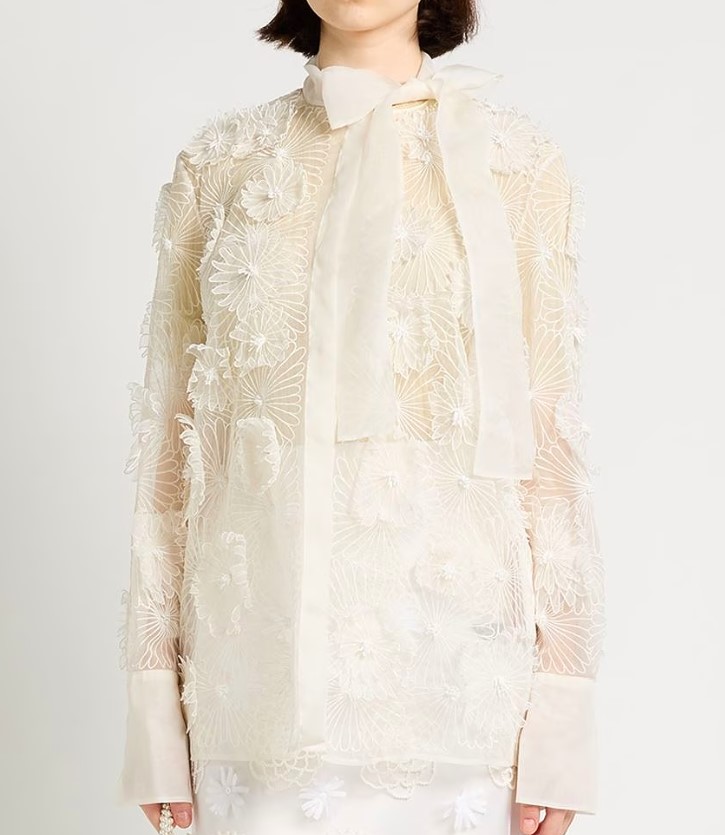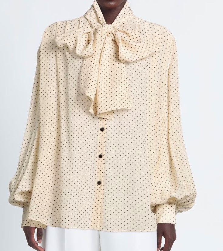 Блуза с большим бантом у лица — отсылка к эстетике 80-х. Такой акцент делает образ выразительным без лишних усилий. Носите с джинсами, классическими брюками или выправляйте бант поверх фактурного жакета — приём, который добавляет образу динамики.