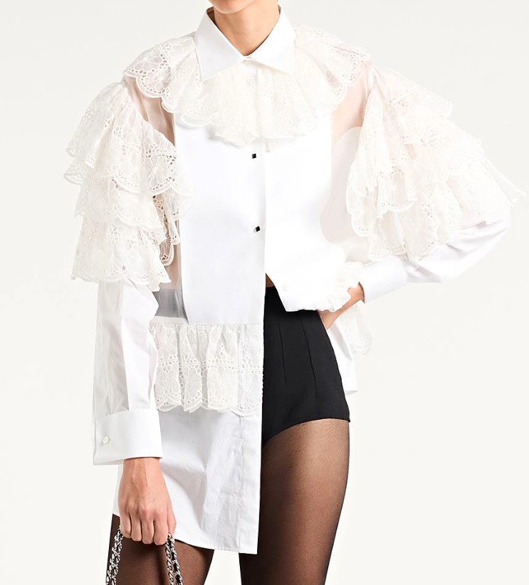 Блузы «из королевских покоев» — для особых случаев. Парча, жаккард, сложные фактуры, рококо-детали и скульптурный крой. Чтобы не перегрузить образ, сочетайте такие модели с лаконичным денимом или простыми брюками — контраст работает лучше, чем тотальная роскошь.