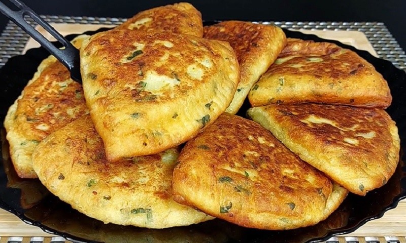 Тесто делят на части, каждую раскатывают в лепешку, выкладывают начинку и защипывают края конвертиком или полукругом. Жарят на среднем огне до золотистой корочки с двух сторон.