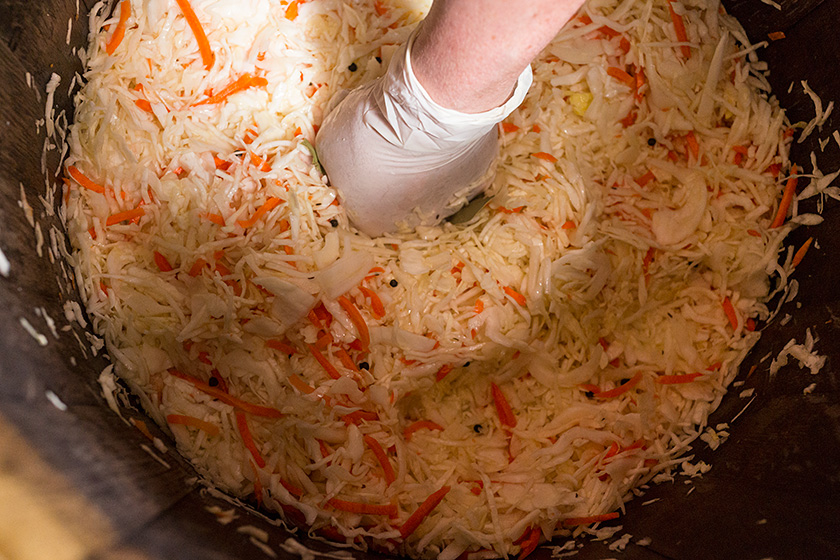 Секрет в деталях: берём 6 килограммов белокочанной капусты, шинкуем её полосками толщиной от 3 до 5 миллиметров — не тоньше и не толще, иначе нужной текстуры не получится, при этом все тёмные и повреждённые листочки безжалостно убираем. Добавляем 300 граммов натёртой моркови, 20 граммов обычной поваренной соли, лавровый лист, молотый перец по вкусу, а если хотите сделать по-настоящему по-советскому — добавьте тмин, бруснику, клюкву или дольки яблок, как разрешал тот самый ГОСТ.