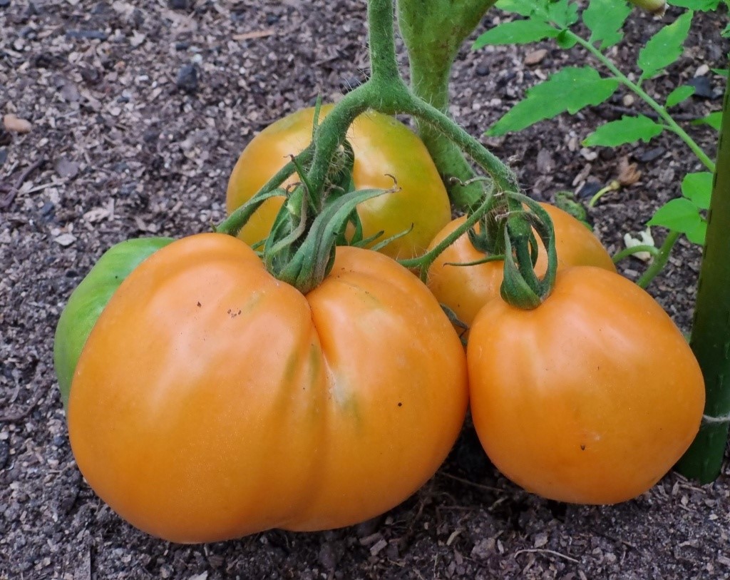 Урожайность и вкус — выше всяких похвал. Первые помидоры созрели уже в конце июля. На каждой кисти — по 4–5 плодов. Средняя масса — 120–200 г. А теперь главное: разрежете помидор — а там сплошное мясо! Семян практически нет, мякоть плотная, сахаристая, очень вкусная. По консистенции напоминает абрикос — такой же насыщенный цвет и сладость.