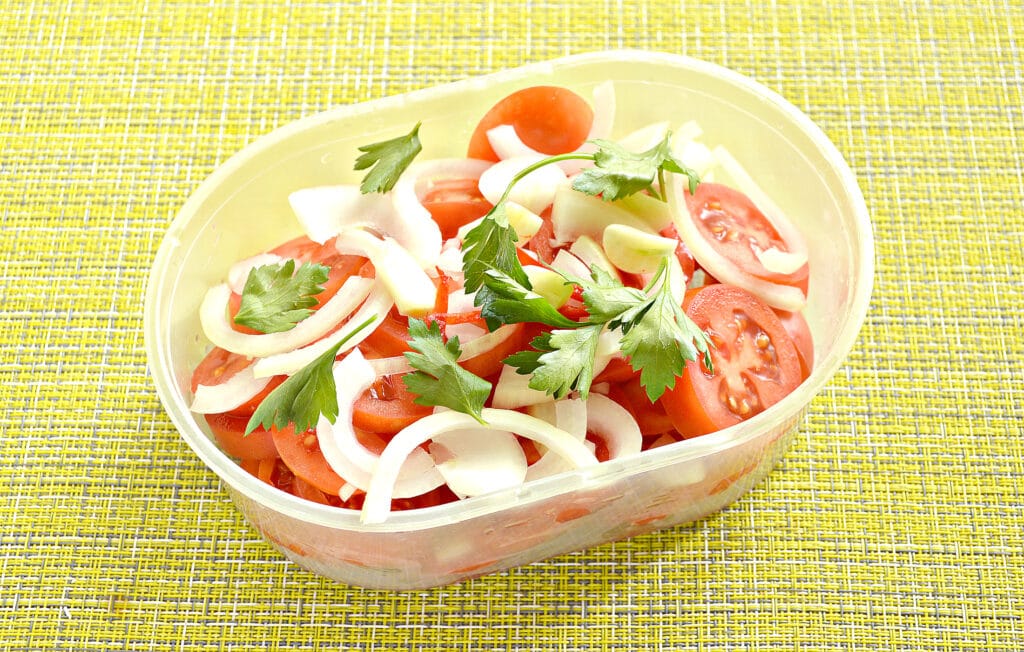 Дальше — маринад. В контейнер прямо к овощам всыпаем соль, сахар, вливаем уксус и растительное масло. Закрываем крышкой и хорошо встряхиваем — так заправка равномерно распределится между слоями. Отправляем в холодильник на 2 часа — и всё! Никаких варок, никаких ожиданий сутками. Через пару часов помидоры готовы: они пропитались, стали нежными, но при этом сохранили форму и хрустящую текстуру.