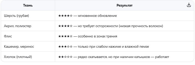 — участки с сильным пиллингом обрабатывают 2–3 проходами с интервалом в 1–2 минуты. - Финал: сухая чистка пылесосом (насадка-щётка) или стирка — чтобы убрать отсоединённые ворсинки.