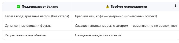 - Температура важна. Тёплая вода (не горячая) комфортнее для ЖКТ, не вызывает спазма и не усиливает охлаждение.