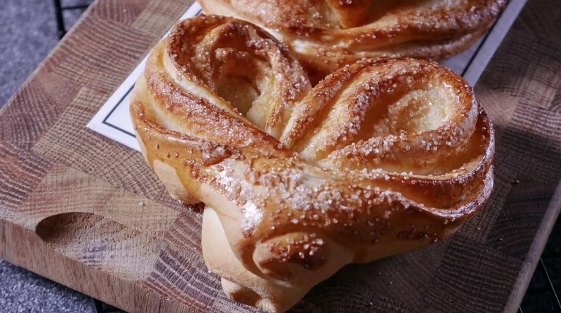 Тесто замешивается быстро: в миске соединяют яйцо, сахар, соль, тёплое молоко и воду, добавляют дрожжи, масло и муку. Готовое тесто оставляют подниматься на час — оно увеличится втрое. Потом его делят на шесть частей, раскатывают, смазывают маслом, посыпают коричным сахаром, сворачивают в рулет, формируют сердечко — и на противень.