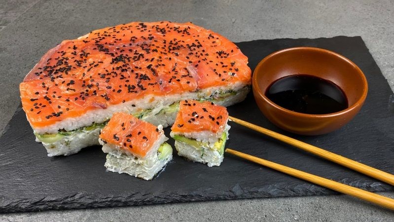 Суши-торт — это как любимые роллы, только в формате «вау». Те же слои риса, рыбы, авокадо и икры — но не в рулонах, а в аккуратном круге, который режется, как десерт, и выглядит как главный гость на столе. И да — его действительно может приготовить подросток. Или взрослый, который в прошлый раз готовил рисовую кашу с подгоревшим дном.