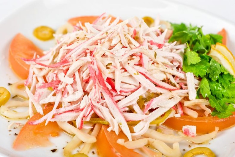 На вкус — нежно, сочно, с лёгкой кислинкой от помидоров и перца, с кремовой глубиной сыра и чеснока. Крабовые палочки не «фон», а акцент — особенно если взять качественные, с минимумом крахмала.
