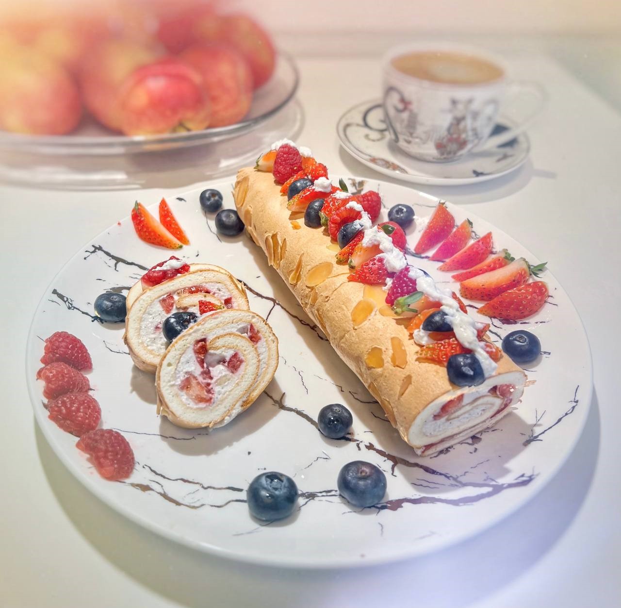 Ягоды — по желанию и сезону. Клубника, малина, ежевика, черника — можно взять свежие или замороженные (только дать им стечь). Их распределяем по крему перед тем, как свернуть рулет. Затем — фольга, холодильник на 2–3 часа для «схватывания», и вот он — готовый шедевр: с кремовой прослойкой, сочной начинкой и блестящей поверхностью, украшенной ягодами и щепоткой миндальных лепестков.