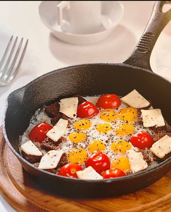 Основа — перепелиные яйца. Их двадцать штук на двоих — звучит много, но каждое — как жемчужина: маленькое, аккуратное, с насыщенным желтком. Они не растекаются, не сливаются в одну массу, а остаются отдельными, как будто их разложили вручную. Сверху — тонкие пластинки адыгейского сыра, который при нагреве не превращается в резину, а лишь слегка подтаивает, оставаясь нежным и чуть солоноватым.