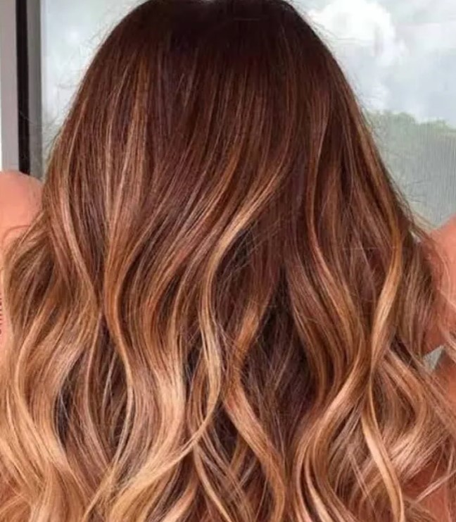 Золотистый балаяж — выгоревшие пряди, как после лета, но без желтизны. Тёплые золотые нити вплетаются в основной цвет, придавая сияние. Особенно эффектно на светлых и русых волосах — создаёт ощущение, что вы только что вернулись из отпуска.