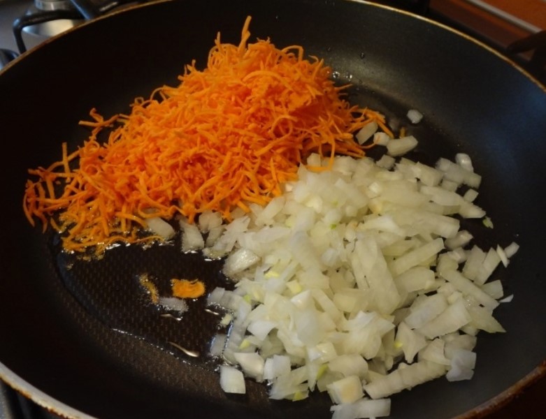 Как только лук станет полупрозрачным и чуть золотистым — самое время добавлять морковь. Огонь при этом лучше убавить: морковь твёрже, ей нужно время, но при сильном жаре лук рискует подгореть. Перемешивать — регулярно, но не агрессивно. Готова зажарка, когда морковь стала мягкой, а края овощей — с лёгким румянцем.