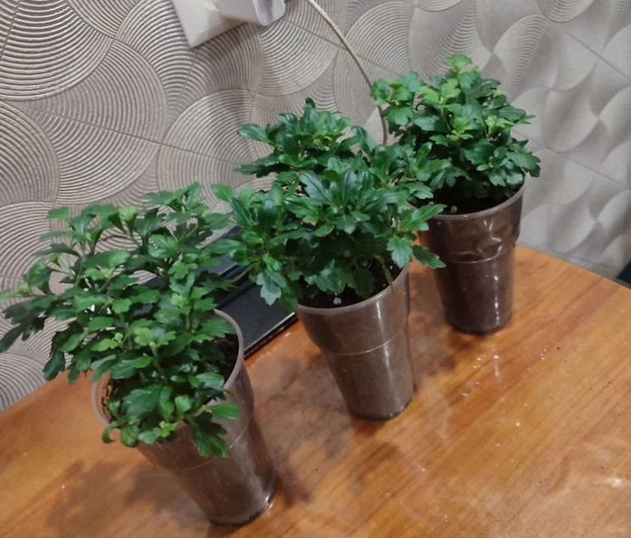 Через 2–3 недели вы заметите: листочки стали твёрже, появились новые побеги у основания — значит, корни есть. Теперь можно перевалить растения в отдельные горшочки по 100–200 мл. По мере роста — увеличивать объём. К маю хризантемы уже будут сильными кустиками, а к августу-сентября зацветут — ярко, обильно, и не хуже купленных в магазине.