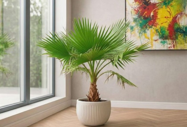 Компактная веерная пальма с сизо-зелёными жёсткими листьями. Очень выносливая: любит солнце, переносит прохладную зимовку и почти не требует полива в холодное время. Идеальна для балконов и светлых комнат.