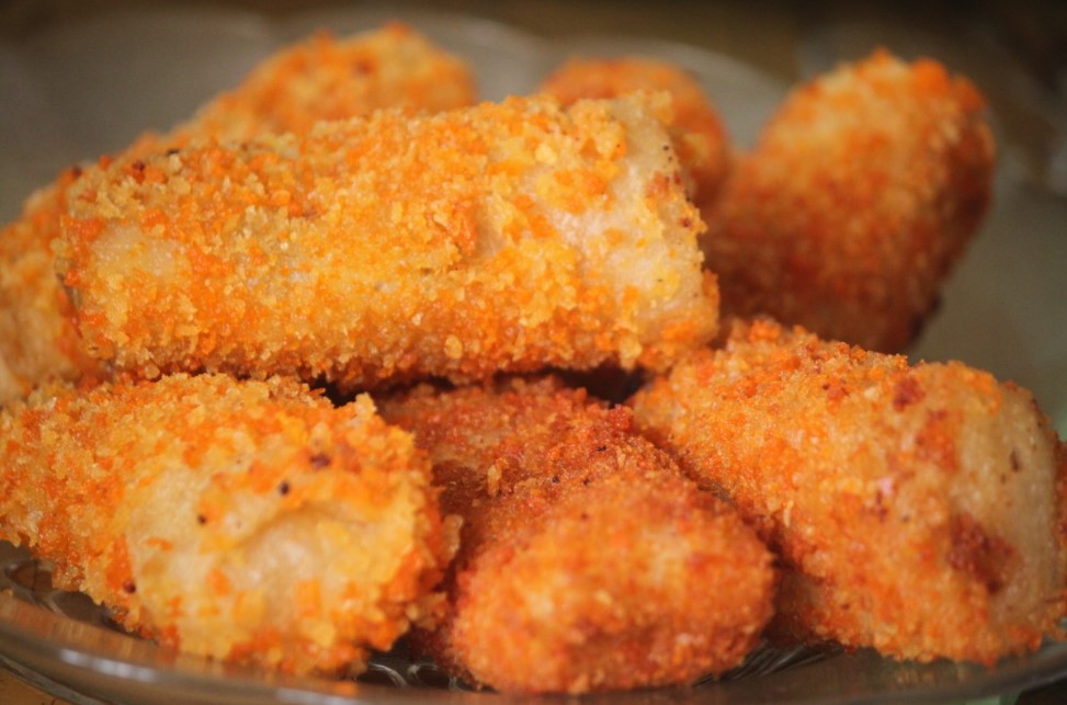 Остывшие кусочки обваливаем сначала в муке, потом окунаем в яичную смесь, а затем снова в муку. Оставляем на 5–10 минут — за это время оболочка «схватится» и не сползёт при жарке.