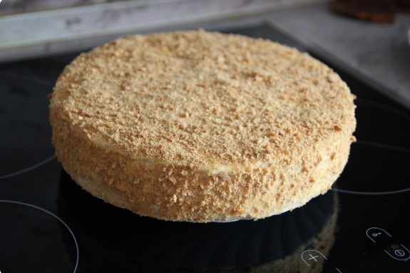 Собирайте торт, щедро промазывая каждый корж. Обмажьте бока, обсыпьте крошкой из оставленного коржа и, по желанию, полейте растопленным шоколадом.