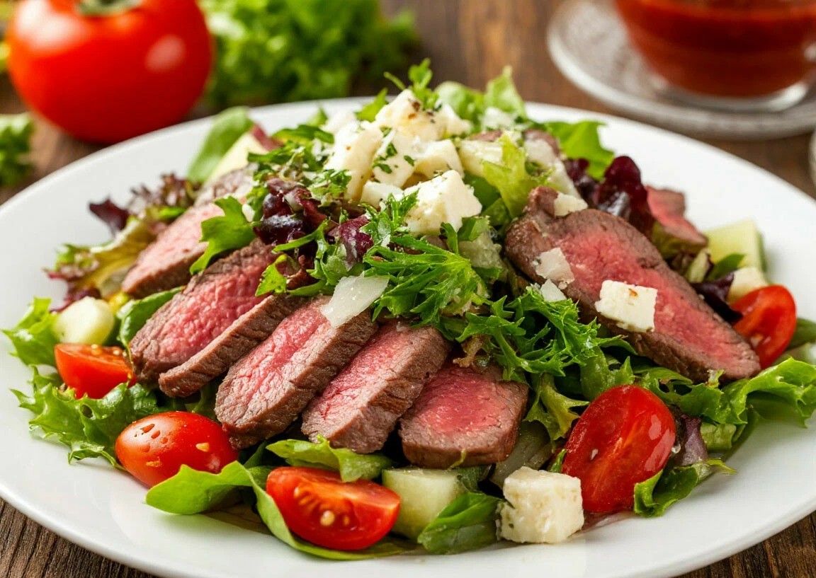 Салат с ростбифом, овощами и сыром — лёгкий, но сытный, с заправкой из оливкового масла, лимонного сока и цедры, горчицы, вяленых томатов и чеснока. Он эффектно смотрится на праздничном столе, готовится быстро и без хлопот, а нравится почти всем.