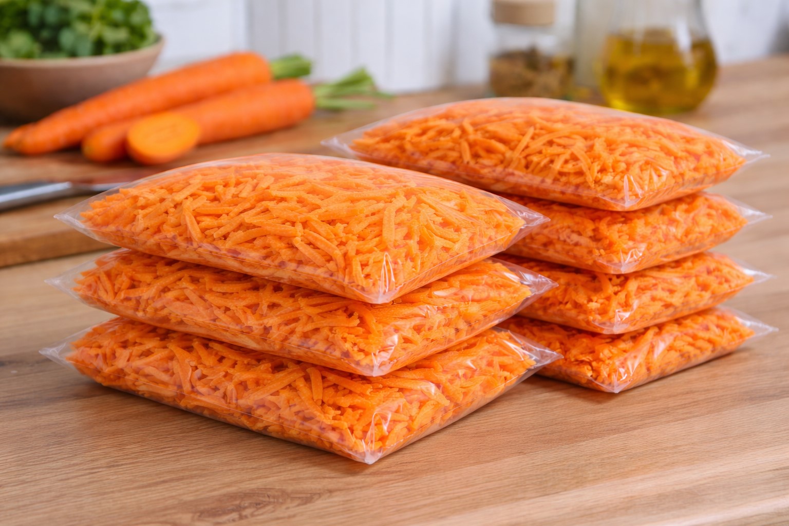 Морковь замораживаю уже натёртой. Крупная тёрка — для зажарок, мелкая — для салатов. Распределяю по пакетам тонким слоем, чтобы потом легко отломить нужный кусочек. Утром для супа: достала, бросила в кастрюлю — и никакой возни с очисткой и трением на кухне. Для салата: разморозила, добавила чеснок и сметану — готово за две минуты.