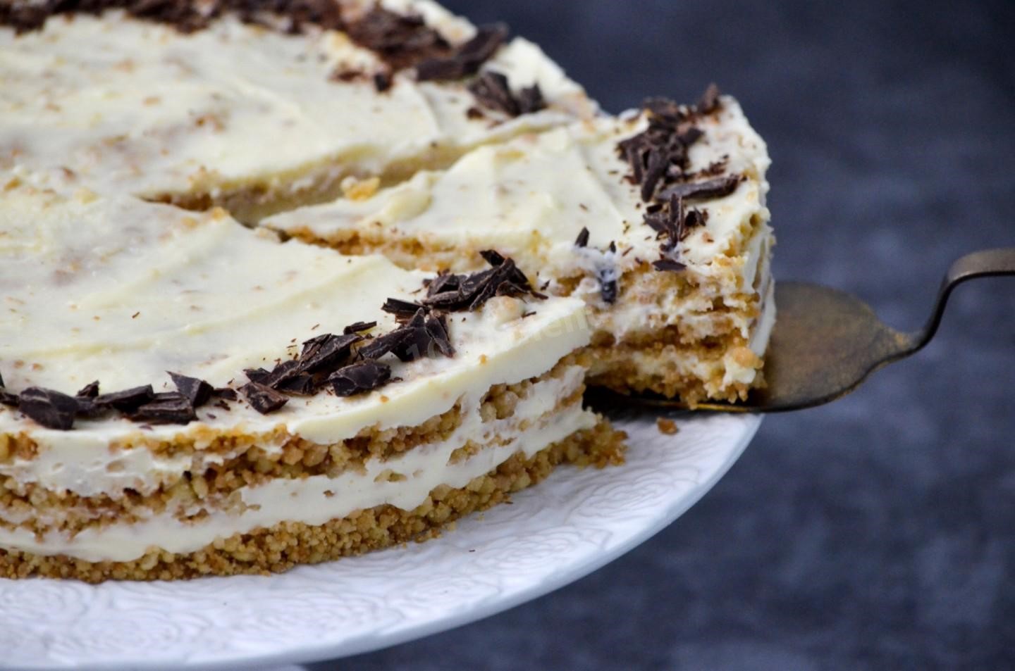 Дальше — самое простое. Берём разъёмную форму диаметром 20 сантиметров, застилаем дно пергаментом и начинаем собирать торт. Слой крошки, слой крема, снова крошка, снова крем — чередуем, пока ингредиенты не закончатся. Верхний слой обязательно делаем из крошки — так торт выглядит аппетитнее и лучше пропитывается. Закрываем форму пищевой плёнкой и отправляем в холодильник на 4–5 часов. За это время крошка впитает сливочную влагу, станет мягкой, а торт превратится в единое нежное целое.