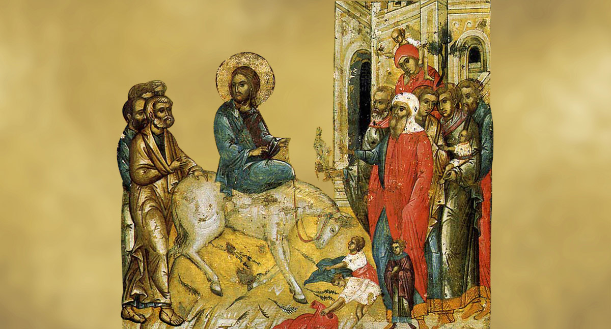 О торжественном входе Спасителя в Иерусалим сообщают все четыре евангелиста. Иисус въехал в город на молодом ослёнке, а жители постилали на Его пути одежды и пальмовые ветви, приветствуя Его как Царя.