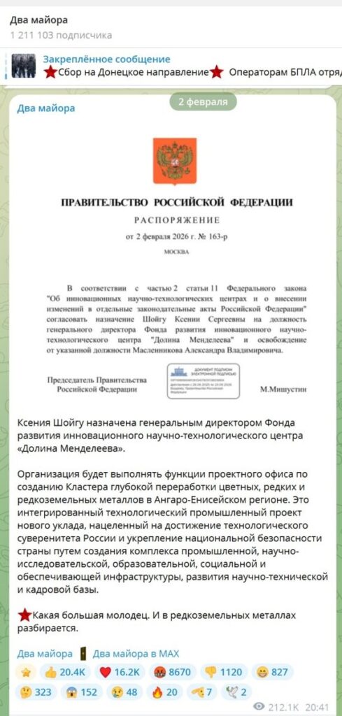 Напомним, Мишустин подписал распоряжении о назначении Ксении Шойгу генеральным директором Фонда развития инновационного научно-технологического центра «Долина Менделеева».