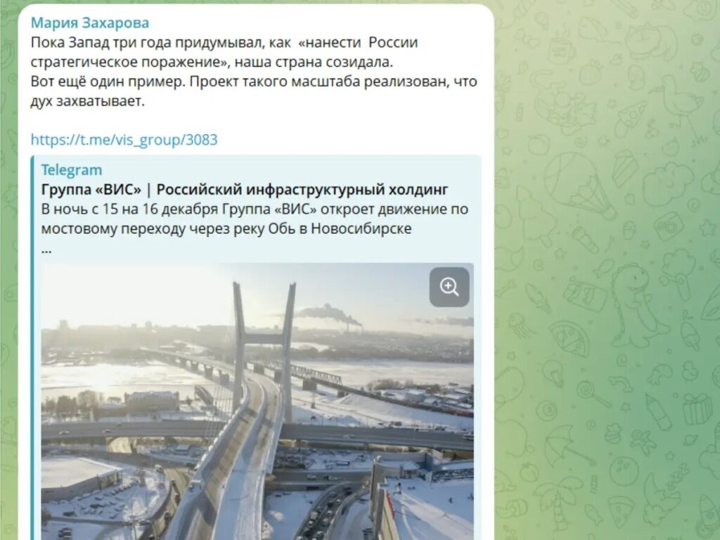 В то время, когда гнев жителей Новосибирска из-за очередного срыва открытия четвёртого моста через Обь достигал пика, неожиданно прозвучали слова поддержки… не горожанам, а проекту. Еще более неожиданным был автор похвалы. Официальный представитель МИД России Мария Захарова, чьи заявления обычно посвящены геополитике, написала: «Пока Запад три года придумывал, как «нанести России стратегическое поражение», наша страна созидала. Вот ещё один пример. Проект такого масштаба реализован, что дух захватывает».