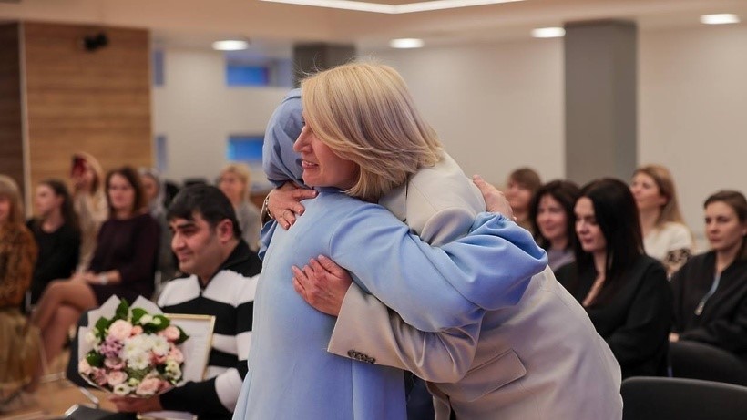 На приложенной фотографии Купецкая улыбается, держа в руках папку с сертификатом. Рядом — Тахмина Самадова в платке.